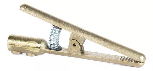 Garra negativa para 500A totalmente em liga de cobre de alta condutibilidade elétrica, fabricada em sistema de pinça dupla angular montadas entre si através de articulação pinada, ranhuras de segurança nas pontas das mesmas, mola de aço de alta pressão que garante um firme fechamento das pinças, proporcionando excelente contato elétrico , alojamento para montagem do cabo de serviço através de dois parafusos tipo bujão